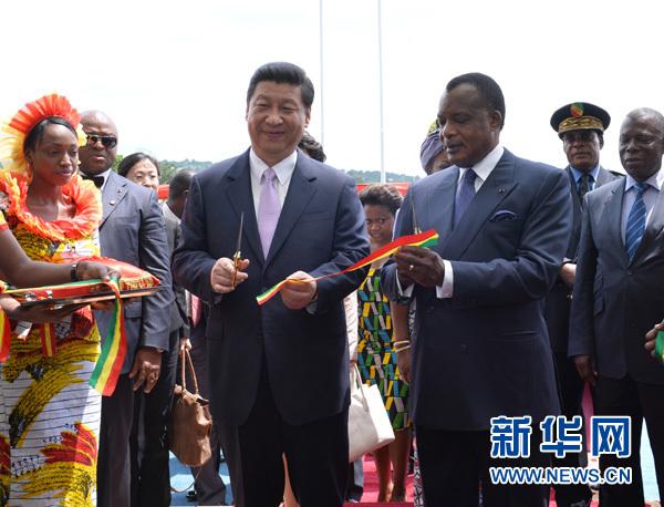 3月30日,国家主席习近平同刚果共和国总统萨苏在布拉柴维尔出席中刚友好医院竣工剪彩仪式。(新华社记者 王晔 摄)