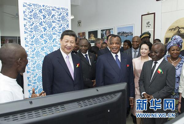 习近平和萨苏共同为图书馆剪彩。随后,两国元首步入图书馆大厅,一同为图书馆和中国馆揭牌。刚果高教部长莫扬代表师生发表讲话,感谢中国为改善刚果教学条件提供的帮助。
