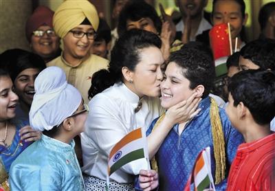 9月18日,印度新德里,彭丽媛访问泰戈尔学校,与儿童亲密互动。