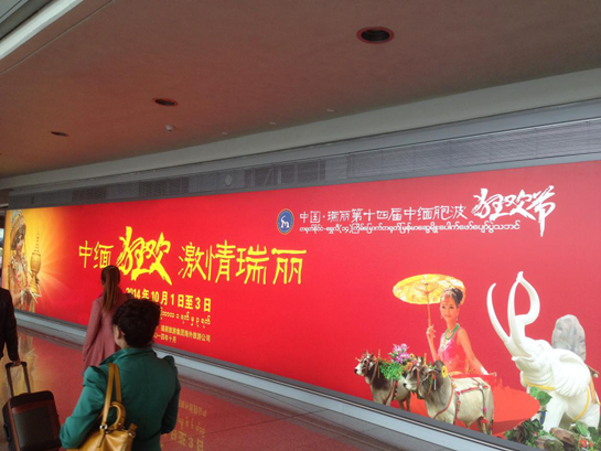 11月10日,记者在昆明长水国际机场转机前往缅甸时在机场拍下的中缅胞波狂欢节宣传广告。(新华社记者 桂涛摄)
