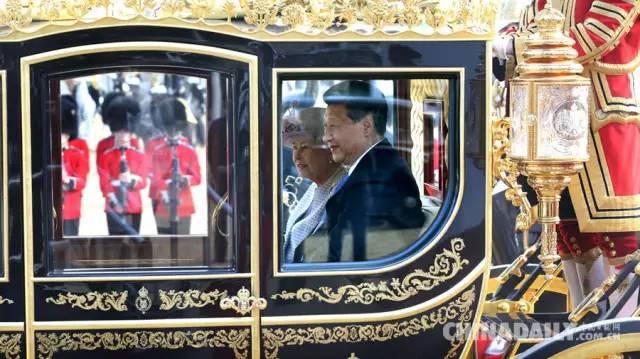 欢迎仪式结束后,在中英两国国歌声中,习近平夫妇在女王夫妇的陪同下,乘坐皇家马车前往白金汉宫下榻。