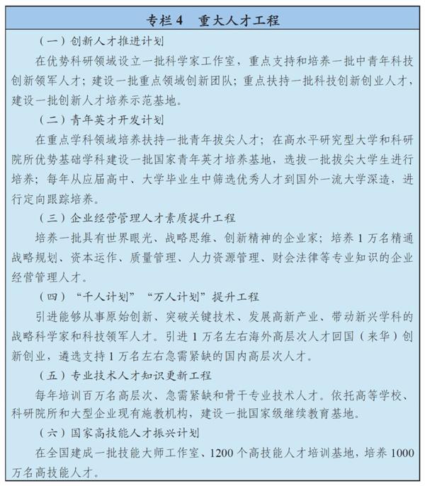 完善人才评价激励机制和服务保障体系,营造有利于人人皆可成才和青年人才脱颖而出的社会环境。发挥政府投入引导作用,鼓励人才资源开发和人才引进。完善业绩和贡献导向的人才评价标准。保障人才以知识、技能、管理等创新要素参与利益分配,以市场价值回报人才价值,强化对人才的物质和精神激励,鼓励人才弘扬奉献精神。营造崇尚专业的社会氛围,大力弘扬新时期工匠精神。实施更积极、更开放、更有效的人才引进政策,完善外国人永久居留制度,放宽技术技能型人才取得永久居留权的条件。加快完善高效便捷的海外人才来华工作、出入境、居留管理服务。扩大来华留学规模,优化留学生结构,完善培养支持机制。培养推荐优秀人才到国际组织任职,完善配套政策,畅通回国任职通道。
