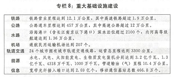六是基础设施网络更加完善。综合交通体系建设全面推进,网络总里程达到494万公里。能源供应能力增强,消费结构优化,非化石能源消费比重上升到12%,煤炭消费比重下降到64%。“宽带中国”战略深入推进,新一代信息基础设施日趋完善。