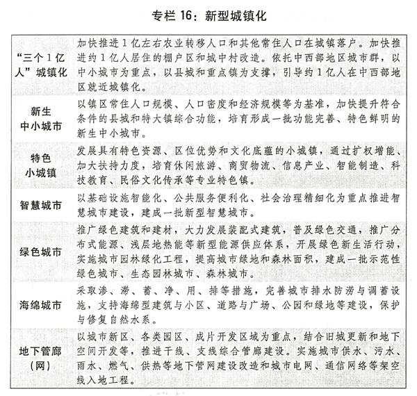 三是以人为核心积极推进新型城镇化。制定实施1亿非城镇户籍人口在城镇落户方案。实施深入推进新型城镇化建设意见,加快户籍制度改革和居住证制度双落地,建立健全农业转移人口与建设用地、建设资金、转移支付“三挂钩”机制,鼓励引导农业转移人口在城镇落户。加大城镇存量建设用地盘活使用力度,积极推进农村土地征收、集体经营性建设用地入市、宅基地三项改革试点。制定全国城镇体系规划。持续推动新生中小城市、特色小城镇培育和新型城市建设,促进符合条件的开发区、陆路边境口岸地区完善城市综合功能。大力发展智慧城市、绿色城市和海绵城市。建设城市地下综合管廊,确保开工建设2000公里。加快京津冀、长三角、珠三角、成渝等城市群城际铁路建设。