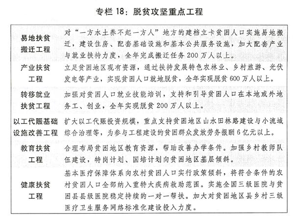 一是全面推进精准脱贫攻坚。支持集中连片特困地区区域发展与脱贫攻坚,启动重点贫困革命老区振兴发展行动计划,加快革命老区开发建设步伐。加大对民族地区、边疆地区脱贫攻坚支持力度。着力改善贫困地区基础设施和基本公共服务,重点解决通路、通水、通电、通网。大力实施脱贫攻坚重点工程。继续支持新疆、西藏和四省藏区发展,加大中央支持和对口支援力度。