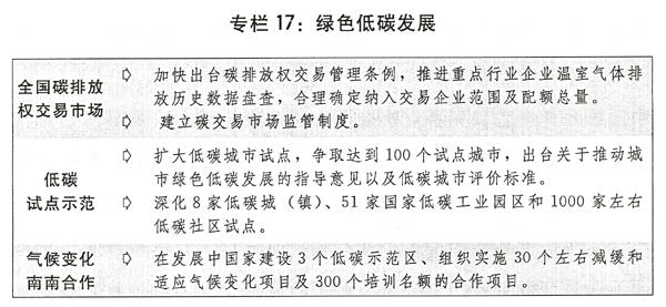 四是提升低碳发展水平。继续推进低碳试点示范。加快建设全国碳排放权交易市场,制定交易、监管等配套细则。建设性参与国际谈判,做好巴黎协定后续机制设计和推动落实,主动引导全球气候治理规则制定,继续加强气候变化“南南合作”。