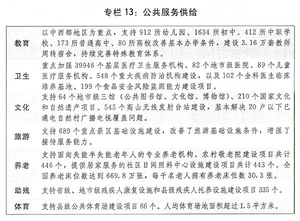 四是公共服务供给水平进一步提升。贫困地区义务教育薄弱学校办学条件持续改善,乡村教师支持计划启动实施,农村贫困地区学生进入重点大学渠道进一步畅通。九年义务教育巩固率、高中阶段教育毛入学率分别达到93%和87%。基层医疗服务体系、重大疾病防治体系、全科医生培养基地建设加强,人均基本公共卫生服务经费达到40元,服务项目扩大到12类。国家基本公共文化服务指导标准发布实施,地市级公共文化服务设施建设支持力度加大。体育产业创新发展取得积极进展。