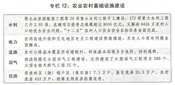 二是农业农村基础设施建设继续强化。重大水利工程建设加快推进。大中型灌区节水改造和新增1000亿斤粮食生产能力规划田间工程加快实施,现代种业基础设施建设得到加强,粮食收储仓容建设力度加大。农村水电路气房等基础设施建设深入推进,城乡基础设施和公共服务设施互联互通、共建共享步伐加快。农业面源污染治理、东北黑土地保护利用、已垦草原治理试点启动,耕地重金属污染治理、地下水超采治理试点积极推进。