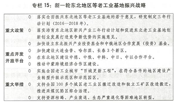 二是深入推进“四大板块”协调发展。支持宁夏、贵州等西部地区发展各具特色的内陆开放型经济,推进创新平台和创新体系建设。加大对中西部地区基础设施等薄弱环节的投资力度,加强生态保护和修复,培育壮大特色优势产业。实施新一轮东北地区等老工业基地振兴战略,培育形成以哈大经济带为主轴的东北地区城市群。出台促进中部地区崛起新十年规划,推动长江中游城市群、中原经济区、皖江城市带等重点经济区发展,推进淮河、汉江生态经济带建设,支持山西建设清洁能源基地。继续支持东部地区在改革创新、转型升级、提质增效上率先发展,发挥示范作用。深入推进海南国际旅游岛建设。大力发展海洋经济,推进海洋经济发展示范区建设。推进国家级新区、承接产业转移示范区等重要功能平台建设,鼓励各地先行先试,在体制机制改革、区域协同发展中当好排头兵。有序推广国家综合配套改革试验区成熟的改革经验。推进重点地区一体化发展,支持有条件的地区开展同城化探索。