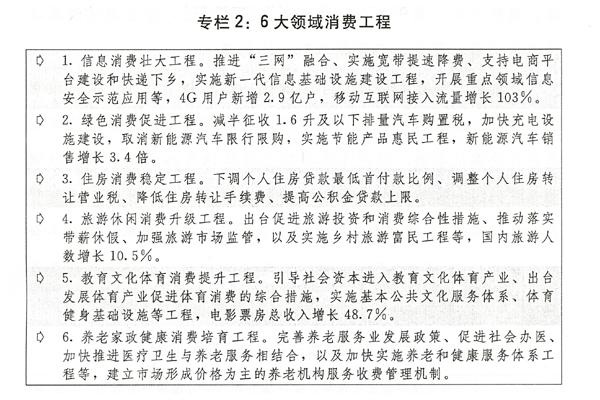 一是推动新消费引领新供给形成新动力。顺应居民消费结构升级趋势,着力推进供给创新,加快形成消费和供给良性互动、需求升级和产业升级协调共进的格局。2016年社会消费品零售总额预期增长11%左右。第一,千方百计提高居民消费能力。着力增加中低收入者收入。落实有利于科技成果转移转化的分配政策。健全促进农民增收机制,探索完善土地增值收益在国家和集体之间的分配机制。第二,大力培育和拓展消费热点。稳定住房和汽车等大宗消费。提高网速、降低网费,加快线上线下融合,支持可穿戴设备、智能家居、数字媒体等信息消费。培育新型服务消费,切实落实带薪年休假制度,发展乡村旅游、红色旅游、生态旅游、研学旅行,有序拓展“老幼”两端消费,扩大和引导文化消费。发展通用航空、邮轮游艇等时尚消费。倡导有利于节约资源、改善环境的绿色消费。充分释放农村消费潜力。第三,扩大有效供给释放潜在消费。鼓励支持地方和企业加大宽带乡村、中小城市信息基础设施、民用空间基础设施等建设力度,推动旅游基础设施和服务设施建设。支持发展城市文化娱乐综合体,推动社会力量举办的大型体育场馆免费或低费开放。丰富健康、家庭、养老、长期护理、文化创意等服务和产品供给。第四,改善消费环境。全面提高标准化水平,健全消费者权益保护机制。开展改善消费品供给专项行动,建立商品质量惩罚性赔偿制度。完善消费品进口关税等相关政策。实施食品安全战略,建立健全食品安全标准和追溯体系。提高药品质量。加强价格监管和反垄断执法,维护市场竞争秩序。