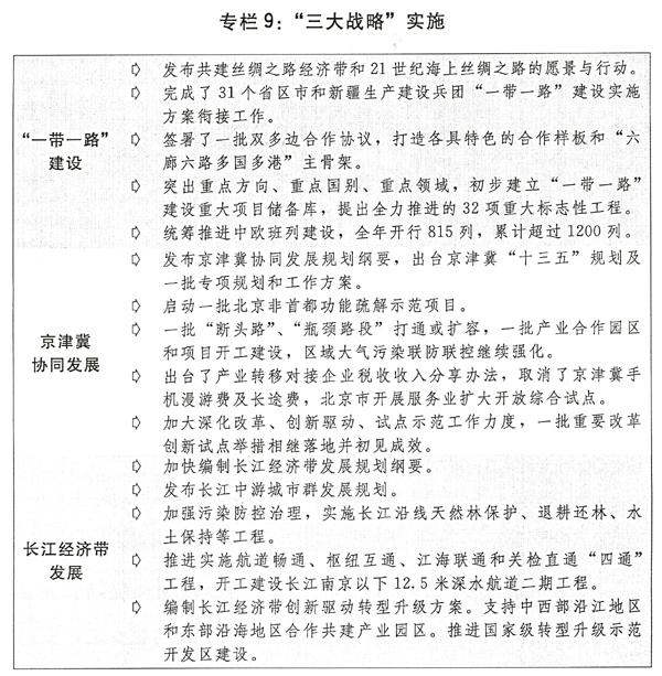 一是重点实施好“三大战略”。统筹推进“一带一路”建设。全面落实京津冀协同发展规划纲要,研究实施控增量、疏存量相关政策措施,启动一批北京非首都功能疏解重大项目,持续推进交通一体化、生态环境保护、产业升级转移3个重点领域率先突破,强化创新驱动试点示范,加快构建协同发展的体制机制。坚持生态优先、绿色发展,着力建设长江经济带“一道两廊三群”,把修复长江生态环境放在首要位置,大力构建绿色生态廊道,高起点高水平建设综合立体交通走廊,着力建设现代产业走廊,发挥长三角、长江中游、成渝三大城市群带动作用。