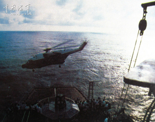 10月12日,天气格外晴朗。发射导弹试验任务一切准备就绪。这天下午14时30分,我率领机组人员精神抖擞地快步走到飞行甲板,地勤人员早已将飞机拉出机库准备好,等待飞行员检查。 一切良好!我和机组人员充满信心地跨入驾驶舱,系好安全带,等待起飞的命令。14时48分,舰上飞行指挥员、团长郭文才向机组发出了“开车”的命令,空中机械师立即启动发动机,顿时旋翼飞转、马达轰鸣。14时53分,指挥员发出了“起飞”的命令,我立即向甲板指挥员发出“解除系留”的信号,“系留已解除!”我立即接通自动驾驶仪,上提变距杆,飞机“刷”的一下离开甲板,低着头吼叫着离舰起飞。