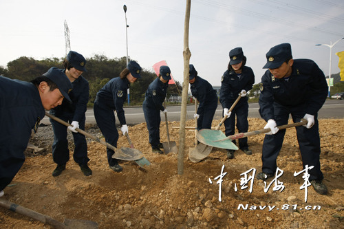 11月6日,东海舰队某水警区20名官兵来到驻地经济开发区开展军民秋季绿化植树活动。寒风中官兵们奋战半个多小时,300颗左右的树木挺立在荒芜的土地上,顿时变得生机盎然起来。拍下身上的尘土,大家纷纷表示能在喜迎党的十八大之际,为建设第二故乡贡献力量,很开心。