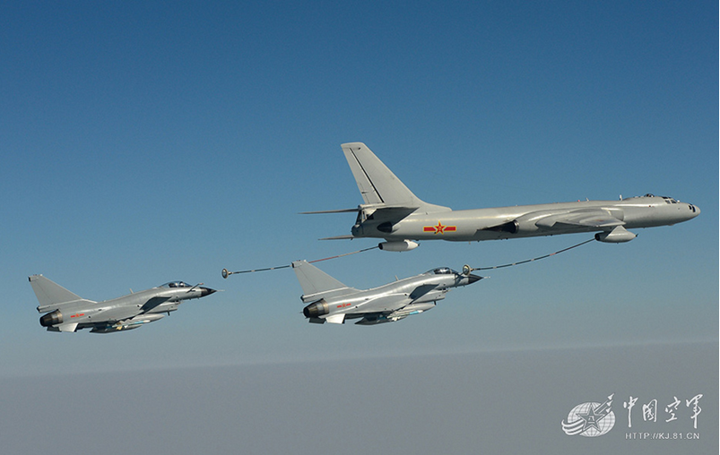 根据美国空军的观察和空中加油机部队的研究,中国的典型编组方式是两架轰油-6(H-6U)支援12架歼八D战斗机。这12架歼-8D分为三个四机编队,可以在1200公里内分别建立3个空中警戒圈保护加受油机。战斗机进行空中加油的最佳空域是在其作战半径的尽头附近,而歼-8D的作战半径大约是800公里。这样即使空中加油作业万一失败,也完全可以依靠机内剩余油料安全返回基地。如果空中加油作业能够顺利进行,歼-8D在接近其预定警戒空域时即可完成受油,随即直接进入阵位,这时空中加油机就可以返回基地了。