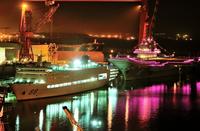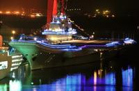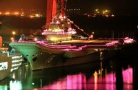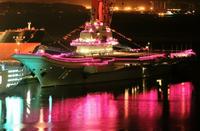 “辽宁舰”节日期间霓虹灯闪亮装点海湾