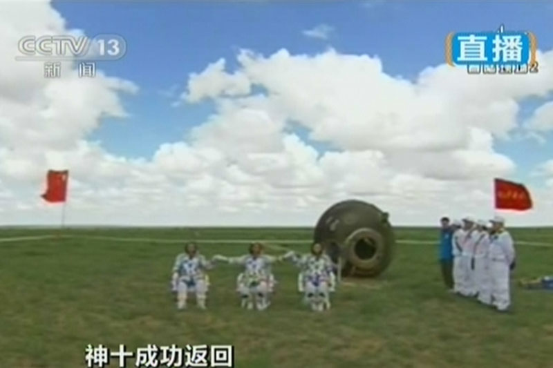 3名航天员顺利出舱,手拉手致意。(视频截图)
