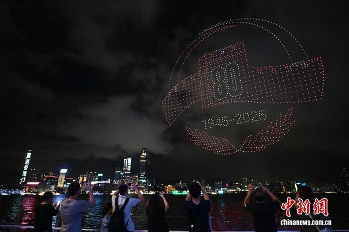 (抗战胜利80周年)无人机在香港维港上空展示纪念抗战胜利80周年图案