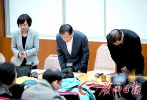 复兴航空代表刘忠继(中)、总经理吴沪生(右)在台北福华会馆介绍与家属的沟通情况,结束后鞠躬致歉。 新华社发