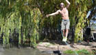 男子鳄鱼池上走"钢丝"