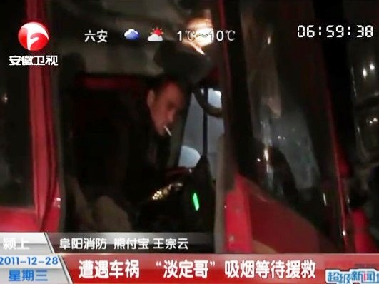 遭遇车祸 “淡定哥”吸烟等待救援