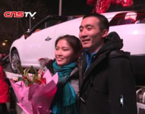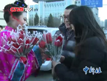 解说:下午4时许,经过约一小时的旅程,7102次“情人节专列”载着大家驶入了终点站南京西站,恋人们、夫妻们手拿玫瑰花,带着对彼此的承诺幸福地走出车站。