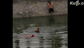 男子发现鸭子被冻湖面 跳湖破冰救援