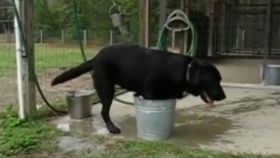 实拍:酷暑难耐狗狗钻进水桶来降温