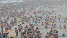 实拍青岛海滨浴场游客扎堆如"下饺子"