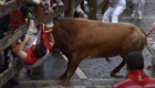 现场:公牛反跑顶人刺穿大腿