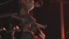 监拍:叉车轮胎碾飞木块 击中50米外男子头部