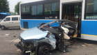 宝马闯红灯撞碎车辆