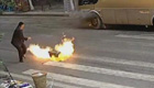 实拍:烟头从天而降点燃车衣引燃车辆