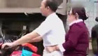 盲大叔骑摩托车上路 妻子坐后面指挥