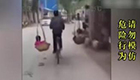 男子挑扁担带俩娃骑车前行