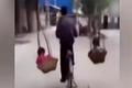 大叔边骑车边挑扁担