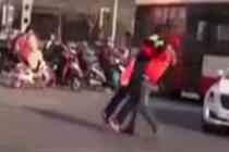 女子强穿马路不听劝阻 志愿者“熊抱”送回