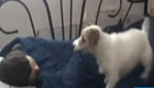 【同期】(香港艺人 林保怡)我刚才在里面是抱着它,抱着它,它还咬我的手指,就轻轻的咬,好可爱,感觉它好喜欢我,那种咬是带着有爱的咬,轻轻地,它1岁,但已经很沉了,很重。