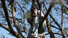 【解说】事故现场,被困妇女一只手死死抓住树干,另一只手则紧紧的抱住4岁的女儿,呼喊求救。而此时农田边上的排水渠受到洪流影响,水流非常大。救援人员查看周边情况后发现,跨过排水渠是通向农田的唯一途径。根据现场掌握情况,救援人员立即架设起二节拉梯,将梯子横跨在水渠上,但由于水流太急,二节拉梯被洪水冲刷得吱吱作响,很不稳固,两名救援人员绑好安全绳,一步一挪的走到排水渠的另一边,接过妇女手中的孩子,搀扶起妇女,向安全地带返回。