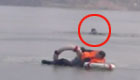 男子发现鸭子被冻湖面 跳湖破冰救援