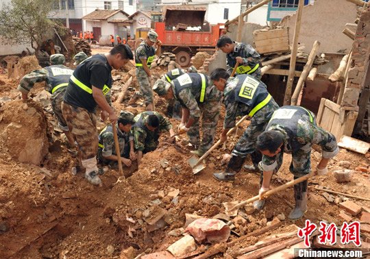 图为民兵正在倒塌的民房现场搜寻。中新社发 刘忠俊 摄