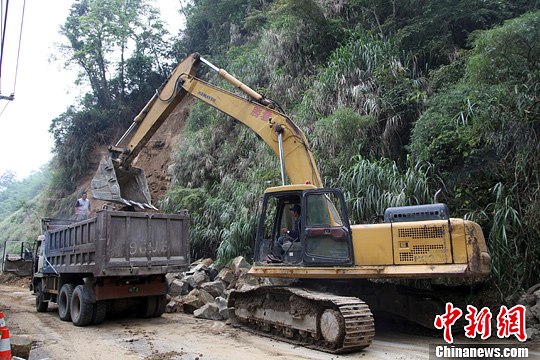 6月3日,台湾中部6.7级地震过后,震央南投县工程车辆在山区加紧清理落石。2日地震发生后,该县山区仍有多处道路受阻,所幸早前受困竹山镇天梯风景区的数百游客已疏散完毕。中新社发 刘舒凌 摄