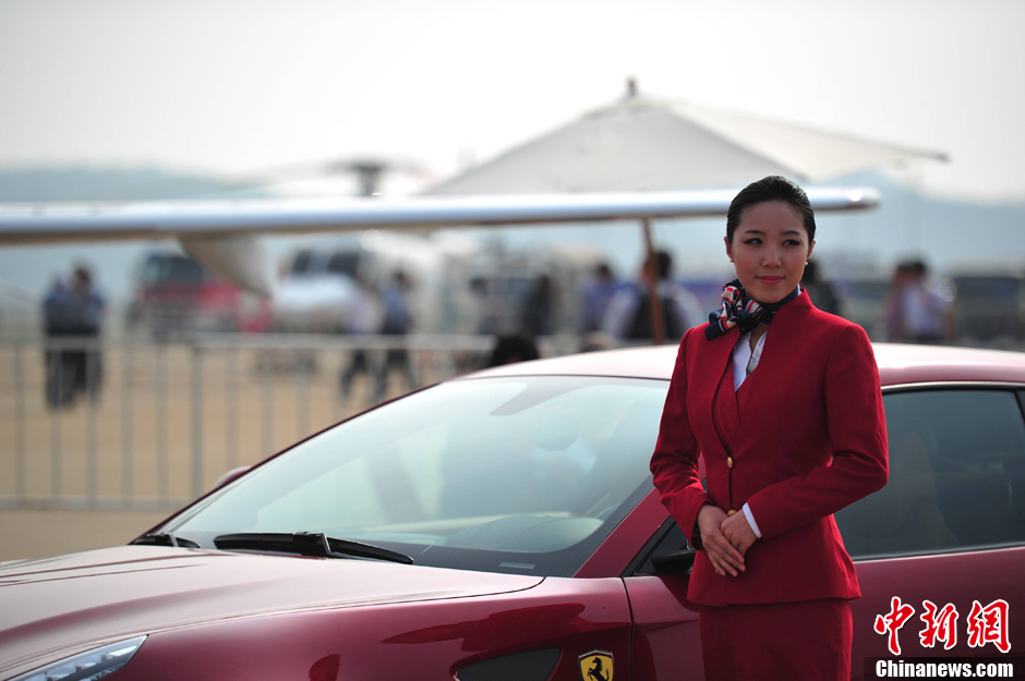 11月14日,第九届中国国际航空航天博览会进入第二天专业观众日,部分参展商在参战飞机前安排了靓丽抢眼的“飞机模特”。中新社发 柯小军 摄