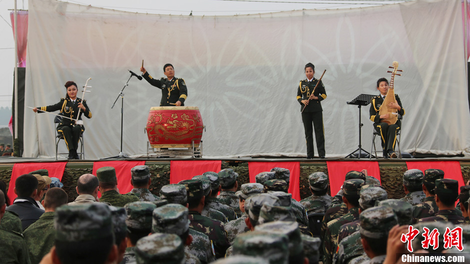 8月10日,随同中方参演部队赴俄罗斯参加“和平使命-2013”中俄联演的沈阳军区政治部文工团演员们,为中俄千余名参演官兵献上了一场精彩的文艺晚会。丰富多彩的文艺节目,将位于切巴尔库尔训练场的中俄联演野营村,变成了友谊的盛会、欢乐的海洋。图为民乐合奏《出征》。中新社发 李祥辉 摄