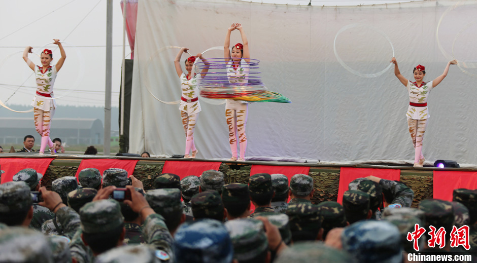 8月10日,随同中方参演部队赴俄罗斯参加“和平使命-2013”中俄联演的沈阳军区政治部文工团演员们,为中俄千余名参演官兵献上了一场精彩的文艺晚会。丰富多彩的文艺节目,将位于切巴尔库尔训练场的中俄联演野营村,变成了友谊的盛会、欢乐的海洋。图为魔术《流光溢彩》。中新社发 李祥辉 摄