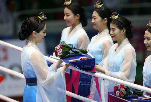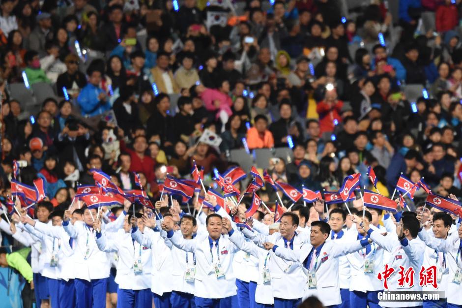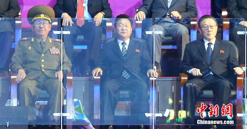 第17届亚运会于4日晚在仁川主体育场举行闭幕式,朝鲜高级代表团成员出席。当地时间晚8时10分许,当朝鲜运动员入场时, 黄炳誓等人起立向运动员挥手致意,体育场内掌声响起。
