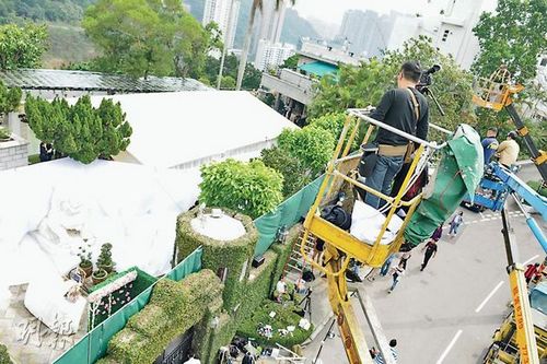 昨日传媒采访“刚晶”婚宴时出动吊臂车。图片来源:香港“明报”