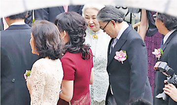 担任婚礼主礼人的香港前律政司长梁爱诗,获霍震霆亲自迎接。图片来源:香港“明报”